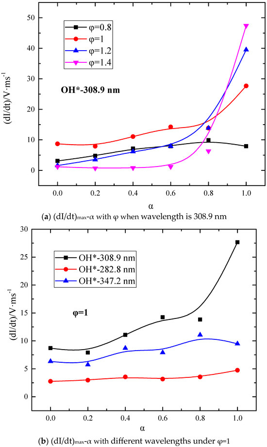 Figure 10 demonstrates the curves of the maximum increase rate of OH emission intensity ((dI/dt)max) and the corresponding time of (dI/dt)max (tdI). The (dI/dt)max at different characteristic wavelengths is along with the change rule of I, which is the largest at 308.9 nm and has the largest increase with the increase in α. When the φ is constant, with the increase in α, the (dI/dt)max of OH continues to increase, and the larger the φ, the greater the (dI/dt)max of OH with α, and the increase rate is the largest when φ = 1.4. Based on the significance of dI/dt, the generation rate of free radicals is obtained from the perspective of intensity, which represents the combustion speed of the flame and shows a close relationship with the laminar combustion speed. When α is constant, the (dI/dt)max increases initially and then decreases as φ increases, and the maximum value of (dI/dt)max appears. When α is 0.6, the maximum value shifts to the side of a larger equivalence ratio. When the component is pure hydrogen, it is the largest at φ = 1.4.