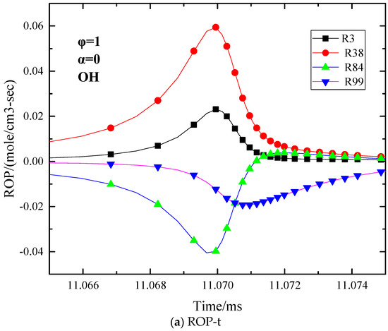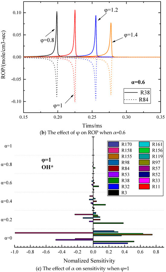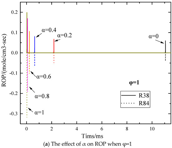 Figure 12 shows the effects of α and φ on ROP and sensitivity of OH in the mixtures when φ = 1 and α = 0.6. The reactions with the strongest formation and consumption rates of OH are R38 and R84, respectively. With the increase in α, the ROP increase in reaction R84 is greater than that of R38, which promotes the consumption of OH, and the increase is significantly improved after α = 0.6. With the increase in φ, the ROP of R38 and R84 increased first and then decreased, and reached the maximum at φ = 1, which was closely related to the concentration of oxygen in the reaction system.