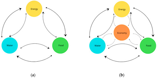 (a) Common WEF Nexus diagram. (b) Water, Energy, and Food Nexus including the economy.