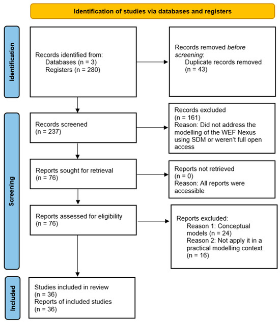 For this review, the PRISMA framework guided the development of a comprehensive search strategy aimed at identifying relevant studies on the application of system dynamics models to the WEF Nexus. It ensured that studies focusing on the integration of economic representation—whether exogenous or endogenous—were captured and analysed. The structured approach facilitated the identification of trends, patterns, and gaps in the literature, ensuring that this review provides an accurate and detailed overview of current research in this field.