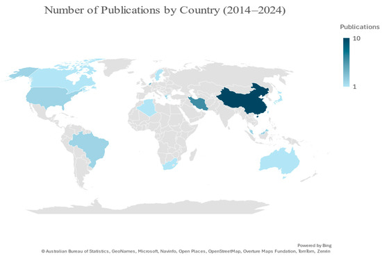 Number of publications by country (2014–2024). This map was created using Microsoft Excel. The source of the map base includes the Australian Bureau of Statistics, GeoNames, Microsoft, NavInfo, Open Places, OpenStreetMap, Overture Maps Foundation, TomTom, and Zenrin. The gradient represents the number of publications, with darker shades indicating higher publication counts.