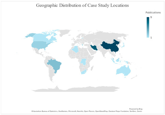Geographic distribution of case study locations. This map was created using Microsoft Excel. The map base sources include the Australian Bureau of Statistics, GeoNames, Microsoft, NavInfo, Open Places, OpenStreetMap, Overture Maps Foundation, TomTom, and Zenrin. The gradient represents the number of case studies, with darker shades indicating a higher concentration of publications focused on specific locations.