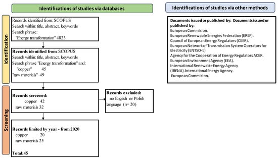 To determine the current state of the art, a literature search was conducted by looking for papers related to the issue of “Energy transformation” in the Scopus database. This search showed that, over the years, the term has appeared as many as 4823 times, mostly since 2020. To examine the literature of the subject matter covered in this paper, the Scopus database was searched (with an initial result of 4823 papers) according to the Prisma method presented in Figure 1. This process finally yielded 45 papers published since 2020 and indicated the existence of a secondary source of literature, which is documents issued by European decision-making units.