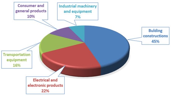Due to the energy transition, as much as 22 million tons of copper should be supplied to the market by 2050, a figure equal to the entire world’s output in 2023. At this point, it should also be emphasized that 22 million tons of copper by 2050 is only the copper needed to implement the energy transition targets. The Energy Transition Commission (ETC) estimates that annual output should rise to a maximum of 34 million t by 2030 under basic decarbonization assumptions, and a minimum of 30 million t with additional increases in efficiency and recycling rates [32]. In addition, copper is used in other sectors, i.e., building construction, transportation equipment, consumer and general products, and industrial machinery (Figure 4).