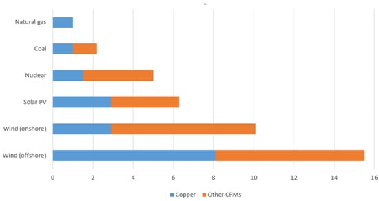 Figure 4 show the consumption of critical raw materials in the technologies that are to contribute to the energy transition. In the chart, it can be seen that each technology entails significant copper consumption. To build an offshore wind power plant, about eight times as many tons of copper per 1 MW are needed in comparison with a conventional power plant. Additions of onshore wind farms and solar power plants require two to three times more copper per 1 MW of installed capacity compared to conventional power plants [33] (Figure 5).