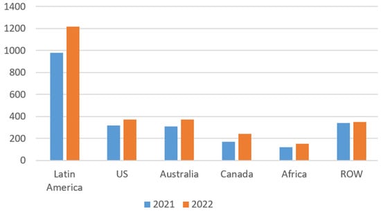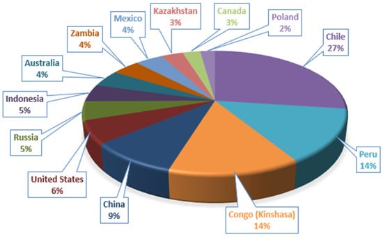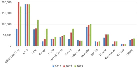 As a result, it is necessary to increase reserves. Such increases take place all the time. Figure 6 below shows how reserves have changed over the past ten years (2013–2023) from 600 million tons to 1000 million tons. Also shown is the change from 2022 to 2023, when reserves increased by 110 million tons. This value shows that, in the near future, reserves may change so that the currently expected supply gap will perhaps be completely closed in a year’s time. The chart below shows that the largest reserves are located in Chile, Peru, Australia and Russia [34,35,36]. Poland ranks eighth in terms of domestic resources (34 million tons). KGHM, in turn, has 40 million t of copper reserves at all of its mines [37].