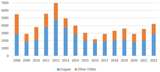 Figure 7 demonstrates that, globally, the largest critical capital expenditures on raw materials (CRMs) are incurred for copper exploration. Since 2016, there has been a gradual increase in spending. There was a decline after 2019, which is likely related to the COVID-19 pandemic. In 2022, the increase in investment in copper exploration was 21%, in comparison with the previous year, and the level of spending was the highest since 2014 at about 3000 USD million [33].