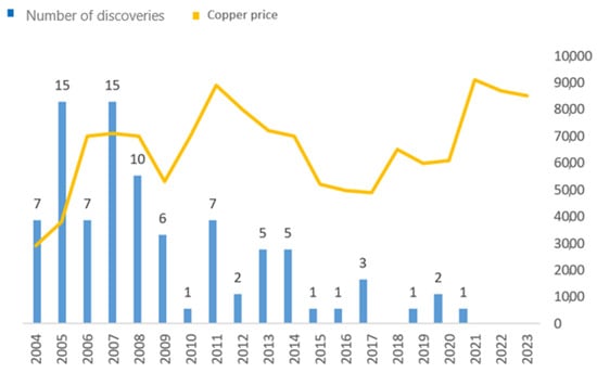 Figure 8 shows the structure of capital expenditure on copper exploration by country. In 2022, Latin America (Chile, Peru) had the largest copper exploration expenditures, followed closely by Australia and Canada. The chart shows that, compared to 2021, all of the mentioned countries increased their spending in 2022—Latin America and Australia by more than 30%, and the US and Canada by approximately 15%. In Africa, there was a slight increase, mainly due to the DRC and Ecuador [33]. However, the average annual increase in capital expenditure on copper exploration does not translate into discoveries of new deposits, the number of which has been declining steadily since 2007. Figure 9 shows the number of newly discovered deposits in the context of copper prices on world markets.