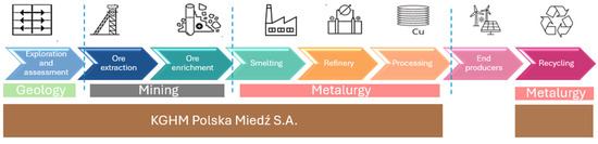 Given the importance of copper in the energy transition, it is also a significant resource for Poland, especially since Poland is a major producer in Europe. In Poland, copper-bearing deposits are located in the western part of the country, and are mined by KGHM Polska Miedź S.A. (KGHM). Considering the copper value chain which contributes to the energy transition, KGHM will be among the companies operating seven of the eight stages of the chain, i.e., exploitation and assessment, ore extraction, ore enrichment, smelting, refining, processing and recycling (Figure 11). Therefore, it is worth analysing the situation of Poland in a global context and consider the requirements of the energy transition in order to be able to draw conclusions about the feasibility of projects aimed at reducing CO2 emissions.