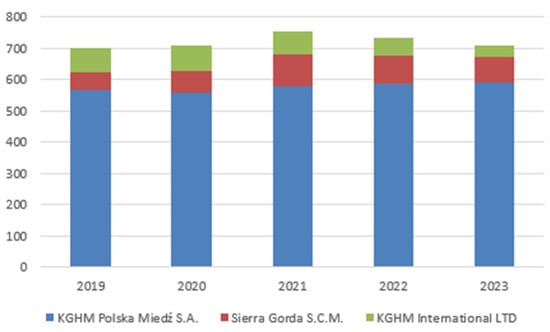 In Poland, KGHM mined 2% of the world’s Cu output. Mining is carried out at the three Lubin mines, with a total of 72,300 tons mined in 2023, as well as at Polkowice-Sieroszowice (198.6 thousand tons), and Rudna mine (174.5 thousand tons). The aggregate output from the three sites adds up to 445,500 t, and this volume ranks Poland 13th in the United States Geological Survey (USGS) (Figure 6). In addition, KGHM also exploits foreign deposits. KGHM International LTD (a subsidiary of KGHM Polska Miedź S.A.) exploits copper bearing deposits in the United States; these are the Robinson mines (31.5 thousand t) and Carlota (3.9 thousand t). It has additional deposits in Canada, in the Sudbury Basin (4500 t) and holds a 55% stake in mining company Sierra Gorda S.C.M. in Chile (143,000 t) [37]. The sum of the Polish company’s domestic and foreign output is 628.3 thousand t, which is nearly 3% of the world’s output.