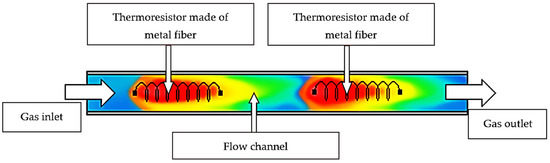 The thermal conductivity detector (TCD) [31,32,33] is the most commonly employed sensor, where concentration determination is based on measuring changes in the electrical conductivity of the thermocouple as a result of variations in the thermal conductivity of the surrounding environment. Although TCDs, also known as cathetometers, are less favored than flame-ionization detectors due to lower sensitivity, they offer significant versatility. As non-selective detectors, they respond to any eluent that exits the chromatographic column, with changes in physicochemical properties that cause variations in the detector’s output. Their non-destructive measurement method allows for the collection of eluents for further analysis. Furthermore, their straightforward design, broad linear dynamic range, and lack of need for supplementary equipment make them suitable for use in portable devices. TCDs can detect both organic and inorganic substances, with typical detection limits depending on the component, ranging from 0.01% to 100% (100–1,000,000 ppm). In a cathetometer, thermal energy is transferred between a heating element positioned in the channel and the flowing gas, or between two heating elements via the gas (see Figure 1).