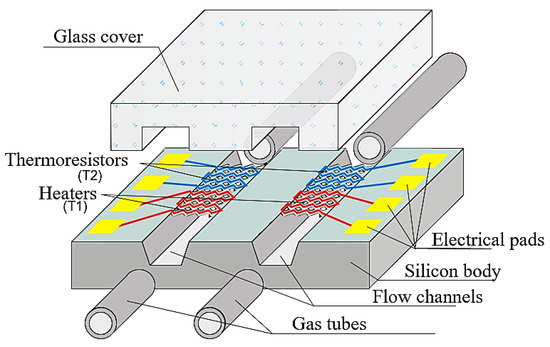 Thermal conductivity detectors, which have been in use for many years, remain essential for analyzing a wide range of substances. Their design facilitates easy miniaturization, leading to their continuous improvement and the resolution of issues found in traditional models. By employing deep spatial micromachining techniques on silicon and microelectronics materials, TCD detectors have become suitable for portable gas chromatographs [11,34,35]. A schematic view of a two-way thermal conductivity microdetector is shown in Figure 2.