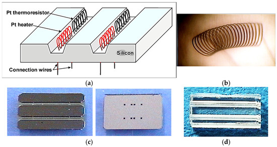 TCD sensor (Wroclaw University of Science and Technology): (a) silicon substrate with etched microfluidic channels and placed miniature Pt (Ni) spirals—visualization; (b) miniature Pt (Ni) spiral; (c) silicon substrate: top view (left) and bottom view (right); (d) glass substrate (Reprinted from J.A. Dziuban, J. Mróz, M. Szczygielska, M. Małachowski, A. Górecka-Drzazga, R. Walczak, W. Buła, D. Zalewski, Ł. Nieradko, J. Łysko, J. Koszur, P. Kowalski, Portable gas chromatograph with integrated components, Sensors and Actuators A: Physical, Volume 115, Issues 2–3, 2004, Pages 318–330, ISSN 0924-4247, https://doi.org/10.1016/j.sna.2004.04.028, Copyright 2004, with permission from Elsevier [11]).