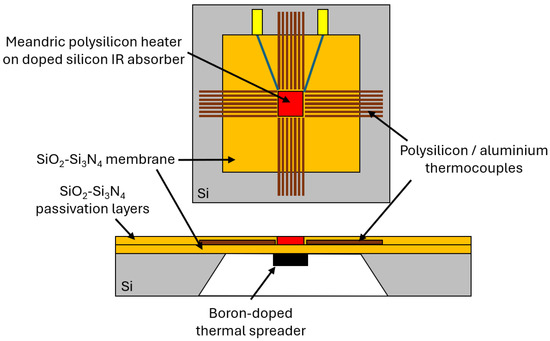 Schematic diagram of a gas calorimeter made on a silicon substrate and SiO2-Si3N4 membrane: a cross-section and top planar view—visualization (based on [36]).