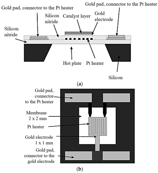 MEMS pellistor: (a) cross-section through the structure—visualization; (b) top view—visualization (Reprinted (adapted) with permission from Bartlett, P. N., & Guerin, S. (2003). A Micromachined Calorimetric Gas Sensor: an Application of Electrodeposited Nanostructured Palladium for the Detection of Combustible Gases. Analytical Chemistry, 75(1), 126–132. https://doi.org/10.1021/ac026141w, Copyright 2003 American Chemical Society [37]).