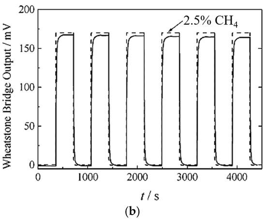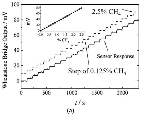 MEMS pellistor: (a) characteristics of the sensor response to stimulation with a variable methane concentration; (b) time response of the sensor to pulse stimulation with a constant methane concentration (Reprinted (adapted) with permission from Bartlett, P. N., & Guerin, S. (2003). A Micromachined Calorimetric Gas Sensor: an Application of Electrodeposited Nanostructured Palladium for the Detection of Combustible Gases. Analytical Chemistry, 75(1), 126–132. https://doi.org/10.1021/ac026141w, Copyright 2003 American Chemical Society [37]).