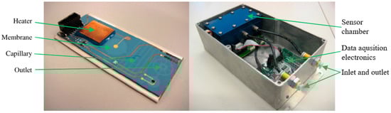 Sensor for measuring gas viscosity: the LTCC sensor (left) and system enclosure (right) (Reprinted from Conor Slater, Thomas Maeder, Peter Ryser, Portable LTCC gas viscometer for determining Wobbe number, Procedia Engineering, Volume 5, 2010, Pages 307–310, ISSN 1877-7058, https://doi.org/10.1016/j.proeng.2010.09.109, based on CC BY-NC-ND 3.0 license [38]).