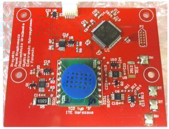 In the novel approach for determining gas calorific value indirectly, the heater is driven by a pulse signal, creating a pulsating thermal wave. This wave is detected by temperature sensors. It is anticipated that the pulse signal will induce characteristic changes in the measured signal, allowing for time-domain analysis. An innovative mathematical algorithm was employed for analysis, involving fitting a function to the output signal, determining function parameters, and relating these parameters to a plane established during calibration. A prototype of the MEMS-based calorific measurement unit, including a test MEMS TCD-like structure (ITE Łukasiewicz Warsaw, Figure 8b) and electronics, has been developed (Figure 9) [40]. Basic parameters are listed in Table 3.