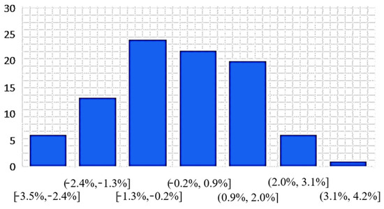The sensor was tested for a three-component mixture that best represents the composition of natural gas (CH4, C2H6, and N2). The uncertainty in calorific value measurement was determined to be 3%; the histogram of the empirically determined calorific value measurement error is presented in Figure 10.