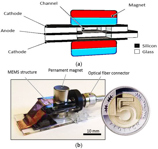 The components: ionization chamber cross-section (a), and view at a glance (b) (Reprinted with permission from P. Knapkiewicz, T. Grzebyk and J. A. Dziuban, “The Sensor for H2 Content Measurements in Hydrogenated Gaseous Fuel”, 2023 IEEE 22nd International Conference on Micro and Nanotechnology for Power Generation and Energy Conversion Applications (PowerMEMS), Abu Dhabi, United Arab Emirates, 2023, pp. 27–29, https://doi.org/10.1109/PowerMEMS59329.2023.10417250 [43]).