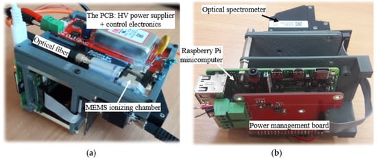The device features a miniature MEMS ionization chamber made of multilayer silicon and glass (Figure 11a,b) [43]. It contains a small volume of about 50 mm3 between two cathodes, two glass spacers, and a central anode. Two permanent magnets above and below the chamber generate a strong perpendicular magnetic field, facilitating gas sample discharge excitation. The chamber connects to an optical spectrometer via fiber optics, with discharge controlled by an integrated high-voltage power supply. Additional electronics include a low-voltage unit and a Raspberry Pi mini-computer (Figure 12a,b).
