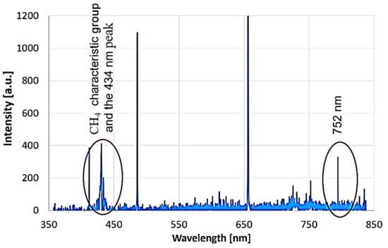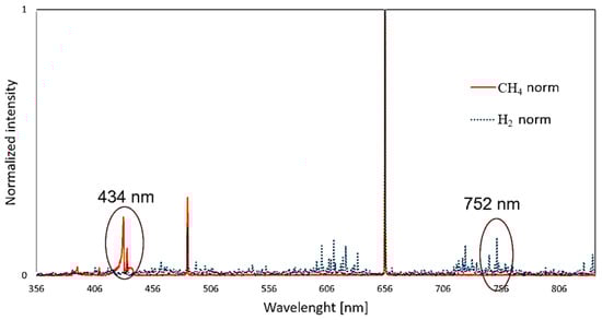 Measurements began by capturing optical signals from pure gases (100% H2 and 100% CH4), as shown in Figure 13. Analyzing methane and hydrogen is more complex due to shared elements, resulting in high-intensity peaks at 486 nm and 656 nm, corresponding to atomic hydrogen. However, unique peaks exist: methane exhibits a broad peak at 430 nm, while molecular hydrogen has bands near 600 nm and 750 nm, with the strongest peak at 752 nm.