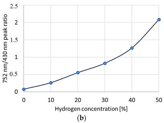 Height of peaks characteristic for methane and hydrogen (a), and the ratio between them (b) as a function of hydrogen concentration (Reprinted with permission from P. Knapkiewicz, T. Grzebyk and J. A. Dziuban, “The Sensor for H2 Content Measurements in Hydrogenated Gaseous Fuel”, 2023 IEEE 22nd International Conference on Micro and Nanotechnology for Power Generation and Energy Conversion Applications (PowerMEMS), Abu Dhabi, United Arab Emirates, 2023, pp. 27–29, https://doi.org/10.1109/PowerMEMS59329.2023.10417250 [43]).