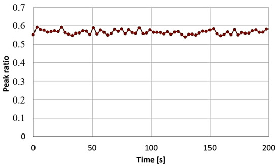 Ratio of the hydrogen 752 nm peak to the methane peak 430 nm as a function of time for 20% hydrogen concentration (Reprinted with permission from P. Knapkiewicz, T. Grzebyk and J. A. Dziuban, “The Sensor for H2 Content Measurements in Hydrogenated Gaseous Fuel”, 2023 IEEE 22nd International Conference on Micro and Nanotechnology for Power Generation and Energy Conversion Applications (PowerMEMS), Abu Dhabi, United Arab Emirates, 2023, pp. 27–29, https://doi.org/10.1109/PowerMEMS59329.2023.10417250 [43]).