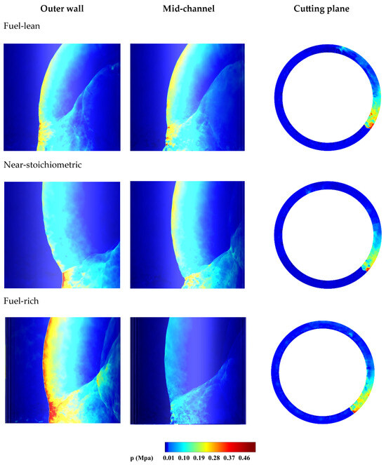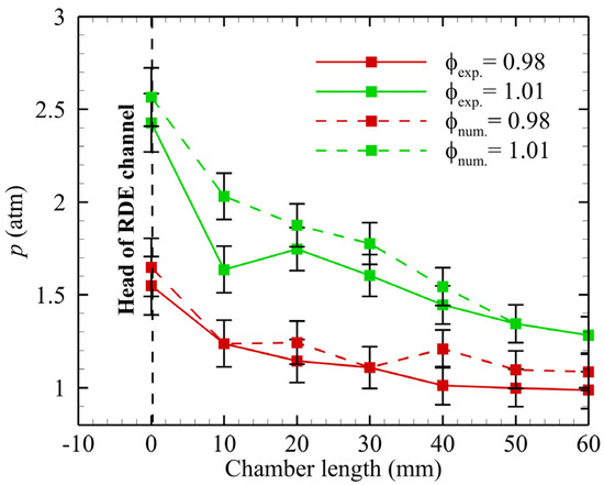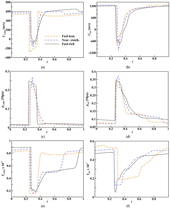| Parameters | RDE Chamber (Initial Conditions) | Fuel-Lean Mixture (ϕ = 0.9) | Near-Stoichiometric Mixture (ϕ = 1.01) | Fuel-Rich Mixture (ϕ = 1.1) | |||