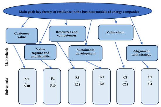 Stage III involved identifying the key resilience factors highlighted in the components of the energy company’s business model. To identify the key factors responsible for the resilience of the energy company’s business model, selected elements of the AHP hierarchical decision problem analysis were used, centered around the main objective of the AHP method, which is to find a ranking of options, ranked according to their suitability from the point of view of various criteria [7,72,73,74]. The method was appropriately adapted to meet the needs and objectives of this study. The main feature of the AHP method is the ability to measure uncountable factors. To measure uncountable criteria and objectives, the opinions expressed in verbal form must be presented in numerical form. In the first phase, a hierarchical structure of the problem is prepared, which, regarding the issue under study, can be referred to as the formulation of the purpose of the study, the definition of criteria, and the evaluation sub-criteria. The hierarchical structure of the main problem (goal): key factors of resilience in the business models of energy companies were developed, and then the evaluations within that structure were generated (Figure 2). The key factors were assessed according to the main criteria.