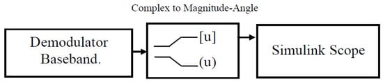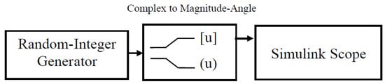 A random integer generator—Random-Integer Generator from the Simulink library—is used as the data source. The generator outputs a sequence of complex numbers, while the input to the virtual observer Scope requires the “amplitude-phase” format. Therefore, it is necessary to apply a converter that transforms complex numbers into the amplitude-phase format, such as the Complex to Magnitude-Angle block (Figure 3).