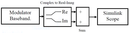 The Complex to Real-Imag blocks, which convert complex numbers into a format separating the real and imaginary parts, used in the mode of generating a time-domain diagram of the modulated signal. Using an additional adder, the outputs of this block are summed.