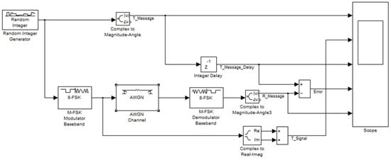The signal frequency Fc = 8 kHz and the carrier frequency Fh = 700 MHz are adopted. At the initial stage, we will simulate the digital modem section using FSK modulation (frequency shift keying) in the M-FSK variant (number of modulation levels M = 4), which is used in Bluetooth short-range communication technology.