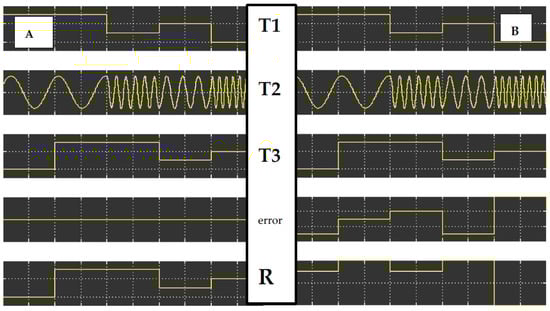 Simulation Results of a Channel with FSK Modulation. T1—Original signal, T2—Carrier frequency with FM modulation, T3—Original signal delayed by the signal propagation time in the wireless channel, R—Signal at the output of the receiving path, error—error signal (distortions) representing the difference between the transmitted and received signals. In Figure 10, the results of simulating transmission modes in a channel with FSK modulation are presented for two cases: operational (A) and nonoperational (B).