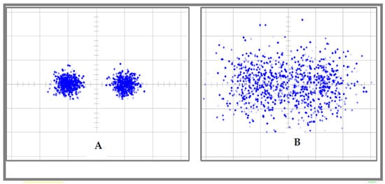 Example of a signal scatter plot for PSK modulation (BPSK—binary PSK) of operational (A) and nonoperational (B) types.