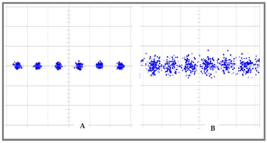 Example of a signal scatter plot for PAM modulation of operational (A) and nonoperational (B) types.