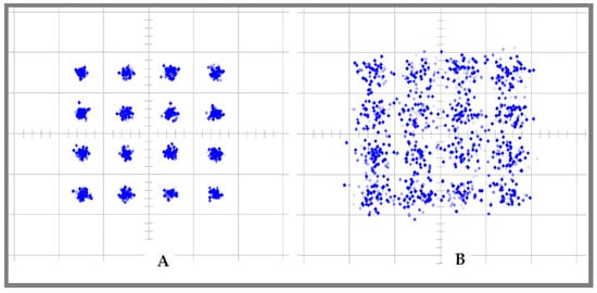 Example of a signal scatter plot for 16-QAM modulation of operational (A) and nonoperational (B) types.