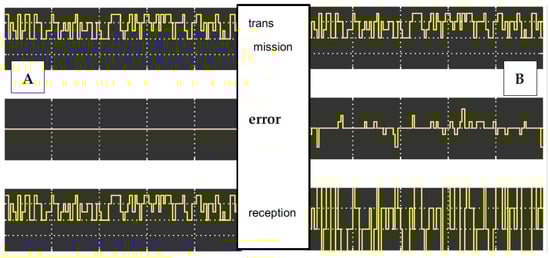 In Figure 10, the results of simulating transmission modes in a channel with FSK modulation are presented for two cases: operational (A) and nonoperational (B).