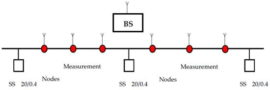 The topology of the LoRaWAN information technology network, “Star within a Star,” used for monitoring emergency conditions of urban 20 kV cable lines, is shown in Figure 15 (Notes: BS—Base station; SS—Substation) [9].
