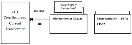 The first option is based on the INA226 microchip [10], which can measure voltages in the range from 0 V to 36 V, independently of the internal power supply voltage, which may vary from 2.7 V to 5.5 V. The operating temperature range is from –40 °C to 125 °C. The chip is powered by a standard 3.6 V battery, whose capacity supports its operation in power-saving mode for up to 3 years. The chip is set to trigger when a voltage threshold is reached, generating a signal through a dedicated alert digital output pin. This signal is sent to a special input of the VEGA CI-22 radio modem [11], where it is processed and transmitted wirelessly, indicating the occurrence of an emergency mode at the measurement location. The threshold is determined and programmed based on the following principle: at the measurement node’s location, the operational range of zero-sequence voltage changes is between 2 and 7 V [12,13,14], and this voltage increases to values above 15 V during a single-phase earth fault [12,15]. Therefore, the threshold for triggering the emergency alert is set at 11–12 V [16,17]. The block diagram of the zero-sequence emergency voltage measurement node, implementing the first option and designed for use on a 20 kV cable line, is shown in Figure 18 (ZCT—Zero-Sequence Current Transformer).