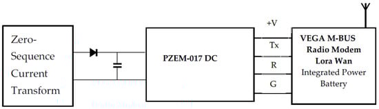 The second option is based on the PZEM-017 DC voltmeter and the VEGA M-BUS radio modem. The block diagram of the measurement node, designed for use on a 20 kV cable line, is shown in Figure 19.