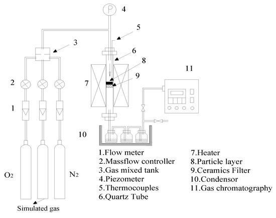The hot oxidative filtration characteristics of FCPs under a biomass gasification gas atmosphere were evaluated in a laboratory-scale fixed-bed reactor. Figure 1 shows the schematic diagram of the experimental setup, which primarily consists of a quartz tube reactor, purification system, and gas chromatograph (GC-2014, Shimadzu, Kyoto, Japan). The quartz tube reactor, with an inner diameter of 20 mm and a thickness of 5 mm, was placed inside the heating furnace. During the experiment, the filtration temperature (TF) within the reactor was measured using thermocouples inserted into the particle layer. Prior to the main test, a temperature control test was conducted, confirming that the temperature variation did not exceed 1 °C. Based on previous research [15], each experiment involved loading a sample of 0.64 g/cm2 (2.0000 g of FCPs) onto the surface of the filter medium for each experiment at a TF of 400 °C. The reactor was heated from room temperature at a rate of 3 K/min, with 100 mL/min of N2 serving as the protective gas during the heating process. Once TF reached 400 °C, simulated gas with a total flow rate of 100 mL/min was introduced into the reactor and maintained for 5 h. The gas exiting the reactor first passed through the purification system before entering the gas chromatograph for component analysis using the method described in the literature [15]. The final data presented in this paper are the average values after removing outliers.