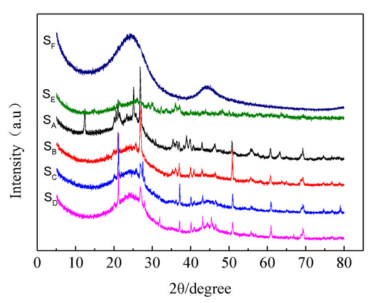 Comparing the XRD characterization between samples SE and SF in Figure 2, the metal oxide peaks in the acid-washed commercial char exhibited a significant decrease and even disappearance, resulting into more pronounced carbon crystal structure peaks at (002) (around 25°) and (100) peak (around 43°). In FCPs, the changes in the two characteristic peaks of the carbon particles could still be clearly observed despite interference from metal oxides. With increasing pyrolysis temperature, the intensity difference in the (002) peak among different FCPs was not apparent, while the intensity of the (100) peak showed differences as the intensity of the (100) peak increased with higher pretreatment temperatures. Generally, the (002) peak represents the degree of parallel orientation and spatial orientation of aromatic carbon layers in micro-crystals, whereas the (100) peak indicates the size of the aromatic carbon layers [22]. The observed changes in FCPs suggest that high-temperature pyrolysis treatment significantly enhances the condensation of the aromatic nuclei. The intensity of the (100) peak of SF was similar to that of SC and SD, indicating the comparable degrees of aromatic nuclei condensation.