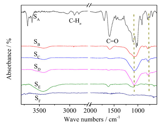 FTIR characterizations of the samples were conducted, as shown in Figure 3. There was a significant decrease in the relative content of decomposable functional groups in FCPs after high-temperature treatment. Specifically, a significant decrease could be observed around 2930 cm−1 and the range of 1600~1750 cm−1, corresponding to aliphatic/branched –CHn groups and oxygen-containing functional groups, respectively. In addition, the obvious absorption peaks around 1100 cm−1 and 810 cm−1 could be observed in Figure 3, suggesting the possible presence of epoxy ether compounds. The commercial char particles (SE and SF) exhibited indistinct aliphatic/branched –CHn functional groups and oxygen-containing functional groups.