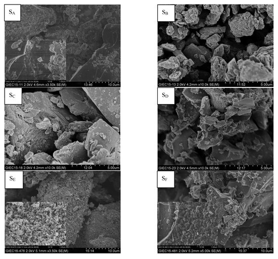 The surface morphology of the samples was shown in Figure 4. The SA sample primarily consisted of two distinct types of particles: those exhibiting severe surface fragmentation and those characterized by relatively flat surfaces. Most of the particles were aggregated, making it challenging to identify the raw material types. This was due to the fact that these particles underwent intense pyrolysis and gasification reactions in the high-temperature environment. They were involved in interactions with both the gasification medium and tar components, resulting in significant fragmentation and diverse particle sizes. The SB, SC, and SD samples were derived from further high-temperature treatment of the SA sample, and showed no significant morphological changes. The SE sample represented the original sample of commercial char, where the surface was coated by the uniformly small particles with a diameter of approximately 1 μm. After acid washing, these small particles were effectively eliminated from the surface of the carbon particles. As shown in the SF image, it was observable that most part of the particle surface was nearly free of such small particles after acid washing, presenting a flat surface with no obvious pore structure. The particles had distinct edges and could be identified as carbon. Nevertheless, a few uniformly small particles could still be discerned on the surface of the commercial char particles. A magnified image of SF particles clearly revealed some “small bulges”, with a diameter of about 1 μm, which were highly similar in morphology to the previously covered uniform small particles. Combined with XRF analysis results, it was inferred that these uniform small particles were metallic oxides.