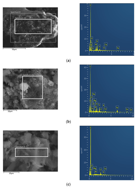 The elemental content on the surfaces of the SA, SE, and SF particles were effectively detected via EDX and the results are shown in Figure 5 and Table 3. It could be seen that the surfaces of the three types of particles, SA, SE, and SF, were mainly composed of C and O elements. Significantly, a relatively high level of metal elements such as Fe and Zn was explored on the surface of SE particles and most would be dissolved in a HCl solution environment, which was consistent with the XRF, SEM, and XRD analysis results.
