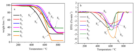 The activation energy E and frequency factor A for the oxidation reactions of each sample were calculated, as presented in Table 5. It can be observed that the SA sample has the lowest E value for oxidation reactions, while the SD sample has highest, indicating that higher temperature treatment led to higher activation energy for oxidation reactions. This may be related to the structural changes induced by high-temperature treatment. Furthermore, the E value of commercial char (SE and SF) was relatively close to that of sample SC, and the frequency factors were in the same order of magnitude. This suggests that the extent of oxidation reactions for commercial char is likely similar to that of sample SC, exhibiting higher activity than sample SD, but lower than samples SA and SB.