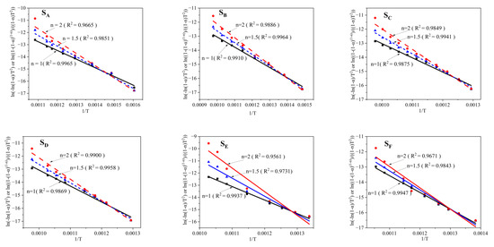 The kinetic parameters during the oxidation reactions of the samples were calculated and are shown in Figure 7 and Table 5. It is evident that the R2 value of the SA sample and commercial char (SE and SF) are closest to 1 at n = 1 through fitting and trial calculation, indicating that the oxidation reactions of these samples were close to first-order reactions, with the mechanism function expressed as F(α) = −ln(1 − α). For samples SB, SC, and SD, the oxidation reactions were close to 1.5 order reactions.
