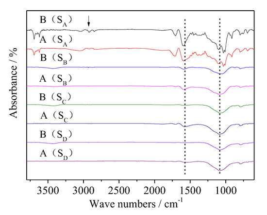FTIR infrared spectra of FCPs: B—before reaction of SA; A—after reaction of SA.(The arrow positions indicate the absorption peak locations of the –CHn functional groups.)