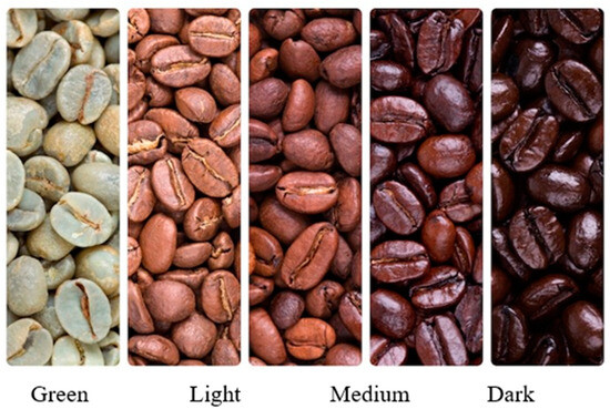 Coffee beans are broadly categorized into specialty beans and commercial beans [12]. Specialty beans have gained significant attention in recent years due to the promotion of light roasting, shown in Figure 2, which has been shown to enhance the antioxidant properties of coffee, particularly chlorogenic acid [13]. Chlorogenic acid is known for its cardiovascular health benefits, distinguishing light roast coffee from traditional medium or dark roasts [14]. Medium and dark roasts, shown in Figure 2, characterized by their heavy, smoky flavors, often result in excessive caffeine content and diminished antioxidant levels due to prolonged roasting times [15]. This shift toward light roasting reflects a broader trend in consumer preferences for healthier coffee options that preserve beneficial compounds while reducing the negative effects associated with over-roasting.